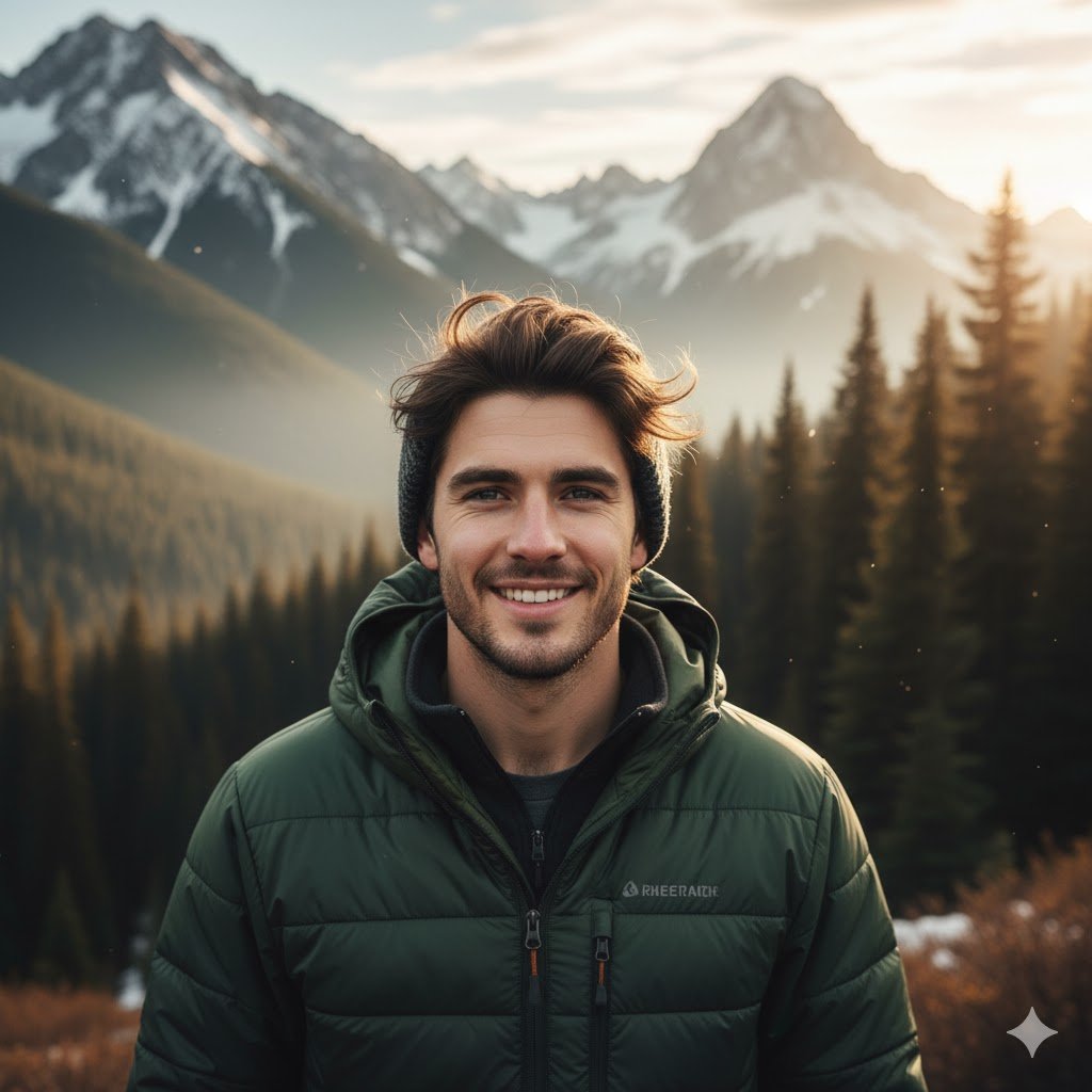 2. “Recreate my photo as a rugged, adventure-themed portrait, with me looking directly at the camera. Place me against a breathtaking natural landscape like snow-capped mountains or a dense forest at golden hour, with slightly windswept hair and a confident, natural smile.”
