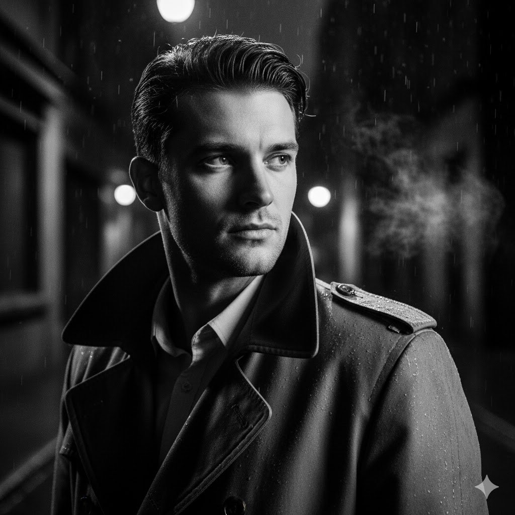 4. “Transform my photo into a classic, black and white film noir-style portrait. Add dramatic shadows and highlights that emphasize my jawline and eyes, with a hint of smoke or rain in the background to enhance the mysterious atmosphere.”