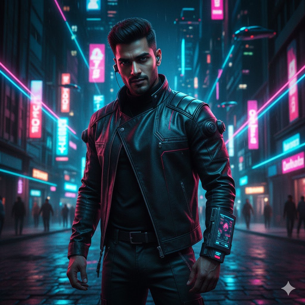 3. “Edit my picture to show me in a futuristic, neon-lit cyberpunk city at night. Give me a sleek, urban outfit with subtle tech elements, and ensure the background lights reflect subtly on my face, creating a dynamic, edgy portrait.”