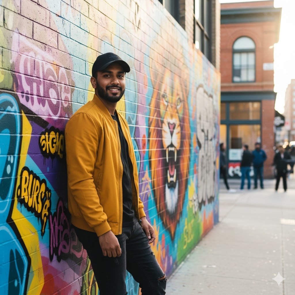 5. “Create a vibrant, urban street-style portrait with me leaning casually against a colorful graffiti wall. Ensure the lighting is bright and dynamic, capturing a cool, confident expression, and integrate elements like a stylish jacket or cap to complete the look.”