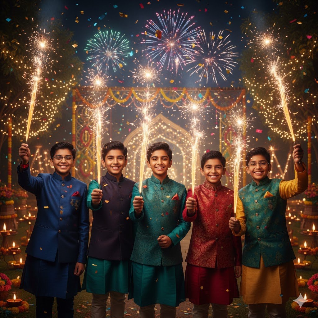 “Edit this group photo of boys to look like we are celebrating Diwali together with sparklers.”
