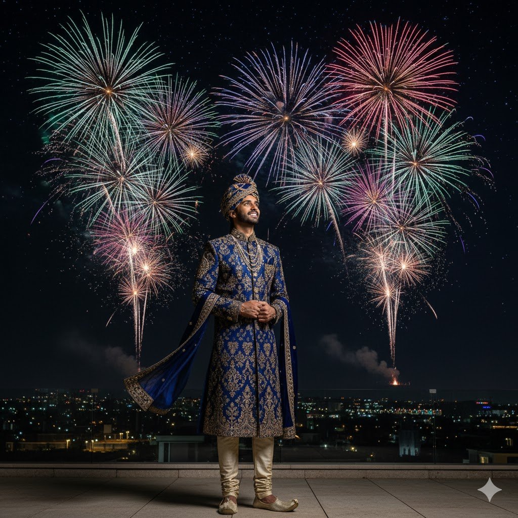 “Enhance my outfit with a sherwani and add fireworks in the night sky.”