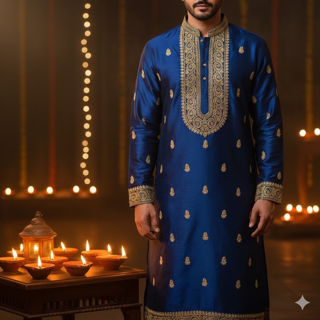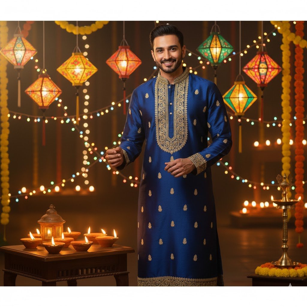 “Edit my photo to make me look like I’m wearing a traditional kurta with golden embroidery, standing near Diwali diyas.”