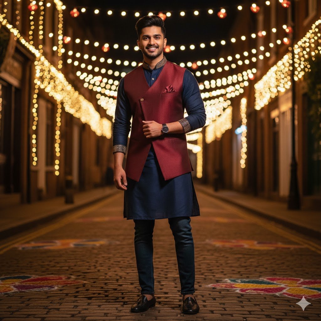 “Give my photo a stylish Indo-western look with Diwali lights in the background.”